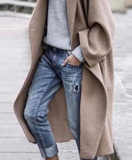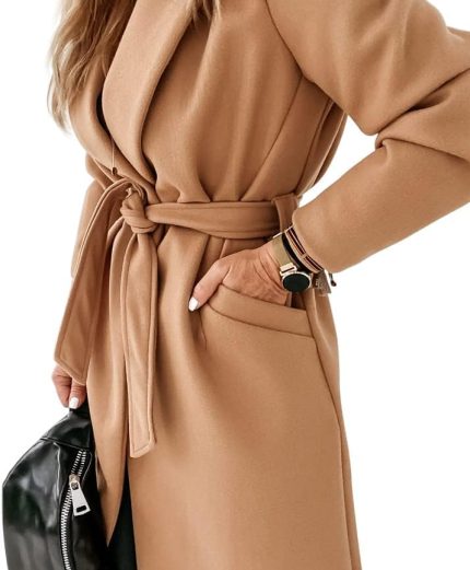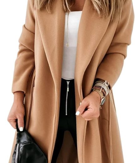 Women Classic Coat Lapel Collar Open Front Bel Long Jacket
