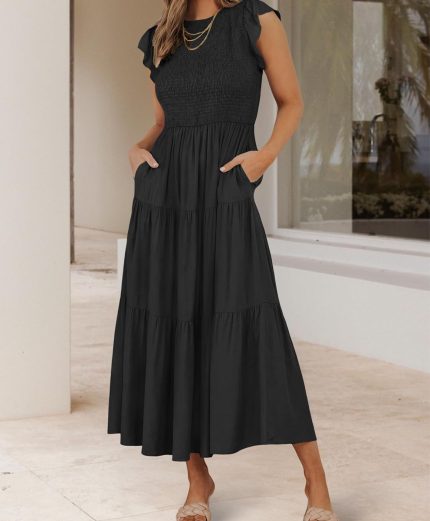 Women 2025 Summer Casual Flutter Short Sleeve Crew Neck Smocked Elastic Waist Tiered Midi Dress