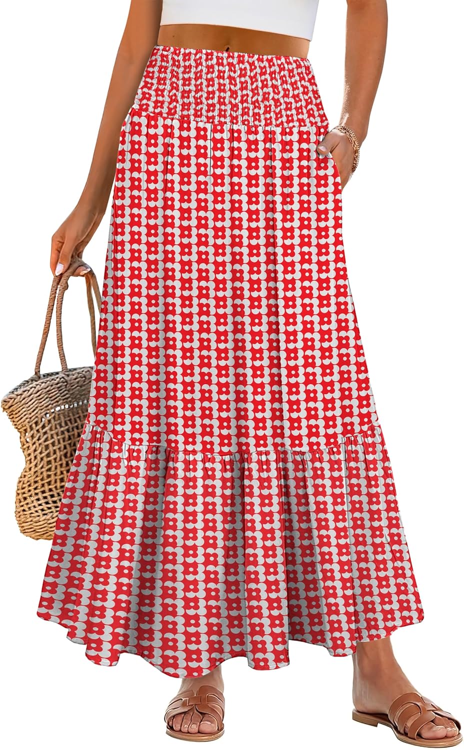 Maxi Skirts for Women 2025 Summer Boho Long Flowy Floral Elastic High Waist Skirt Casual Travel Skirt with Pockets