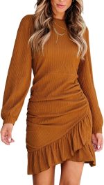 Women Knit Ruched Mini Fall Dress Smocked Ruffle Hem Crew Neck Long Sleeve Bodycon Casual Summer Autumn Dresses