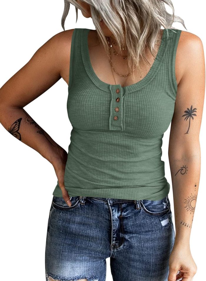 Women Sleeveless Henley Tank Tops Ribbed V Neck Button Down T Shirts Summer Slim Fit Tee Tops