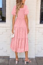 Women Summer Casual Midi Dresses Square Neck Short Sleeve Smocked A Line Floral Flowy Elegant Boho Dress